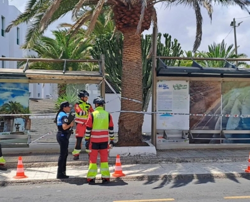 NewsTwo people were slightly injured when one of the glass panels on a bus shelter in Costa Teguise broke yesterday.