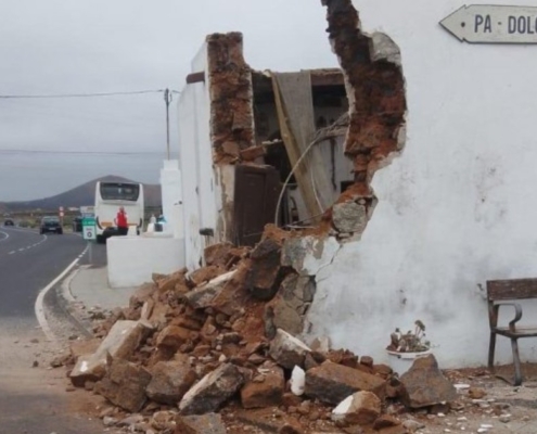 NewsA coach lost control and seriously damaged the corner of a building in Mozaga yesterday, leaving rubble on the road.