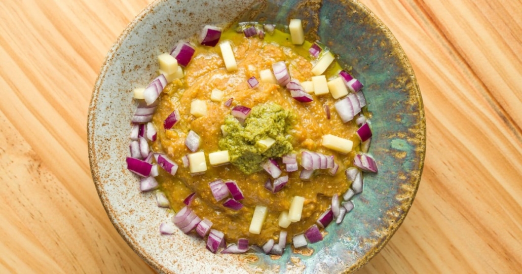 4. To serve, put the gofio in a lebrillo (a typical Canarian semi-glazed earthenware bowl) and decorate with chopped red onion and chopped queso fresco.