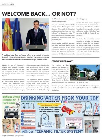 10 | Gazette Life | August 2025GAZETTE | NEWSWELCOME BACK%u2026 OR NOT? A political row has unfolded after a proposal to name Spanish Prime Minister Pedro S%u00e1nchez persona non grata on Lanzarote before his summer holidays on the island.S%u00e1nchez is one of Lanzarote%u2019s greatest fans, regularly spending summer breaks with his wife and two daughters at Las Maretas, the %u201cKing%u2019s House%u201d near Costa Teguise. However, this year S%u00e1nchez arrives at a delicate time. Recently, Santos Cerd%u00e1n, his right-hand man and ex-secretary of the Socialist Party, has been imprisoned on suspicion of corruption charges, while two more party bigwigs also face investigation. Then, in midJuly, S%u00e1nchez%u2019s close colleague, Francisco Salazar was accused of sexual harassment and creating a toxic workplace for women. The opposition Partido Popular (PP) have called for new elections, having seen their chance to topple S%u00e1nchez%u2019s fragile majority government in the same way he defeated them in 2018, following the PP%u2019s involvement in the immense G%u00fcrtel corruption case. And on Lanzarote, the local PP, led by Astrid P%u00e9rez, joined the clamour. P%u00e9rez told the Canarian parliament that S%u00e1nchez was %u201cnot welcome%u201d on Lanzarote, while PP councillors on Lanzarote%u2019s Cabildo proposed a motion to name himpersona non grata. Such a motion would not have any real force, but would simply act as a symbolic statement by the island government. However, to pass the motion the PP would require the support of the CC, their partners in the ruling group. It%u2019s the first time such a proposal has been made in response to a visit by a political leader, and the Socialist Party responded furiously, calling the motion %u201cridiculous%u201d and accusing the PP of %u201cbeing all over the place.%u201dIn Har%u00eda, the socialist-led council extended a greeting to S%u00e1nchez, saying it would be %u201can honour%u201d for him to come back to the town where he was photographed visiting the pretty Saturday market last year. T%u00edas, also ruled by the Socialists, repeated the invitation. PEDRO%u2019S HIDEAWAYThe palace at Las Maretas was designed by C%u00e9sar Manrique and his architect friend Fernando Higueras. Known widely as %u201cThe King%u2019s House%u201d, it was originally built for King Hussein of Jordan before he presented it to Juan Carlos I of Spain in 1989. Over the years, the palace has hosted Spanish PMs Aznar and Zapatero as well as world leaders such as Helmut K%u00f6hl, Vaclav Havel and Mikhail Gorbachev.