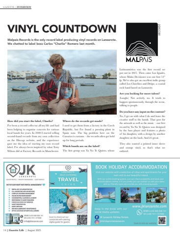14 | Gazette Life | August 2025GAZETTE | INTERVIEWVINYL COUNTDOWNMalpa%u00eds Records is the only record label producing vinyl records on Lanzarote. We chatted to label boss Carlos %u201cCharlie%u201d Romero last month.How did you start the label, Charlie?I've been a record collector all my life and had been helping to organise concerts for various local bands for years. In 2000 I started selling second-hand records from my own collection on the Discogs website, and the experience gave me the idea of starting my own record label. I've always been inspired by what Tony Wilson did at Factory Records in Manchester.Where do the records get made?I used to get them from a factory in the Czech Republic, but I've found a pressing plant in Spain now. The big problem here on the Canaries is customs %u2013 the records often get held up for long periods.Which bands are on the label?The first group was Ya No Te Quiero, whose Latinoam%u00e9rica was the first record we put out in 2021. Then came Los Iguales, whose Malas Decisiones was our first 12%u201d lp. We've also got an excellent indie group called Los Clavelitos and Dr%u00fbpe, a coastal rock band based on Lanzarote.Are you looking for more talent?(Laughs) Not actively, no. It tends to happen spontaneously, through the scene, talking to people.Do you have any input on the content?No, I get on with what I do and leave the creative stuff to the bands. That goes for the artwork as well as the music %u2013 our first record by Ya No Te Quiero was designed by the bass player and features a photo of his daughter, with a design by another daughter on the back. And it's great.They also wanted a printed inner sleeve and orange vinyl, so that's what we ordered. MYCMYMalpa%u00eds-Logo.pdf 1 10/3/22 20:50