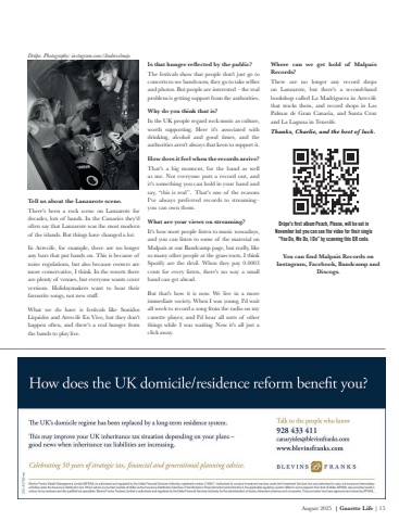 August 2025 | Gazette Life | 15Tell us about the Lanzarote scene.There's been a rock scene on Lanzarote for decades, lots of bands. In the Canaries they'd often say that Lanzarote was the most modern of the islands. But things have changed a lot.In Arrecife, for example, there are no longer any bars that put bands on. This is because of noise regulations, but also because owners are more conservative, I think. In the resorts there are plenty of venues, but everyone wants cover versions. Holidaymakers want to hear their favourite songs, not new stuff.What we do have is festivals like Sonidos L%u00edquidos and Arrecife En Vivo, but they don't happen often, and there's a real hunger from the bands to play live.Is that hunger reflected by the public?The festivals show that people don't just go to concerts to see bands now, they go to take selfies and photos. But people are interested %u2013 the real problem is getting support from the authorities.Why do you think that is?In the UK people regard rock music as culture, worth supporting. Here it's associated with drinking, alcohol and good times, and the authorities aren't always that keen to support it.How does it feel when the records arrive?That's a big moment, for the band as well as me. Not everyone puts a record out, and it's something you can hold in your hand and say, %u201cthis is real%u201d. That's one of the reasons I've always preferred records to streaming%u2013 you can own them.What are your views on streaming?It's how most people listen to music nowadays, and you can listen to some of the material on Malpa%u00eds at our Bandcamp page, but really, like so many other people at the grass roots, I think Spotify are the devil. When they pay 0.0003 cents for every listen, there's no way a small band can get ahead.But that's how it is now. We live in a more immediate society. When I was young, I'd wait all week to record a song from the radio on my cassette player, and I'd hear all sorts of other things while I was waiting. Now it's all just a click away.Where can we get hold of Malpa%u00eds Records?There are no longer any record shops on Lanzarote, but there's a second-hand bookshop called La Madriguera in Arrecife that stocks them, and record shops in Las Palmas de Gran Canaria, and Santa Cruz and La Laguna in Tenerife.Thanks, Charlie, and the best of luck.Dr%u00fbpe's first album Peach, Please, will be out in November but you can see the video for their single %u201cYou Do, We Do, I Do%u201d by scanning this QR code. Dr%u00fbpe. Photography: instagram.com/AndreselmejoYou can find Malpais Records on Instagram, Facebook, Bandcamp and Discogs.