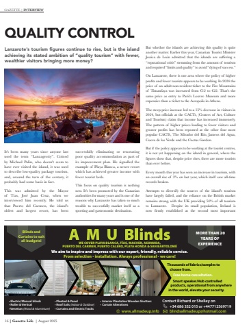 16 | Gazette Life | August 2025It's been many years since anyone last used the term %u201cLanzagrotty%u201d. Coined by Michael Palin, who doesn't seem to have ever visited the island, it was used to describe low-quality package tourism, and, around the turn of the century, it probably had some basis in fact.This was admitted by the Mayor of T%u00edas, Jos%u00e9 Juan Cruz, when we interviewed him recently. He told us that Puerto del Carmen, the island's oldest and largest resort, has been successfully eliminating or renovating poor quality accommodation as part of its improvement plan. He signalled the example of Playa Blanca, a newer resort which has achieved greater income with fewer tourist beds.This focus on quality tourism is nothing new. It's been promoted by the Canarian authorities for many years and is one of the reasons why Lanzarote has taken so much trouble to successfully market itself as a sporting and gastronomic destination.QUALITY CONTROLLanzarote's tourism figures continue to rise, but is the island achieving its stated ambition of %u201cquality tourism%u201d with fewer, wealthier visitors bringing more money? But whether the islands are achieving this quality is quite another matter. Earlier this year, Canarian Tourist Minister Jessica de Le%u00f3n admitted that the islands are suffering a %u201creputational crisis%u201d stemming from the amount of tourism and required %u201climits and quality%u201d to avoid %u201cdying of success.%u201dOn Lanzarote, there is one area where the policy of higher profits and fewer tourists appears to be working. In 2024 the price of an adult non-resident ticket to the Fire Mountains of Timanfaya was increased from %u20ac12 to %u20ac22. That's the same price as entry to Paris's Louvre Museum and more expensive than a ticket to the Acropolis in Athens.The steep price increase led to a 15% decrease in visitors in 2024, but officials at the CACTs, (Centres of Art, Culture and Tourism) claim that income has increased immensely. The pattern of higher prices leading to fewer visitors and greater profits has been repeated at the other four most popular CACTs, The Mirador del R%u00edo, Jameos del Agua, Cueva de los Verde and the Cactus Garden.But if the policy appears to be working at the tourist centres, it is not yet happening on the island in general, where the figures show that, despite price rises, there are more tourists than ever before.Every month this year has seen an increase in tourism, with an overall rise of 3% on last year, which itself saw all-time records broken. Attempts to diversify the sources of the island's tourism have largely failed, and the reliance on the British market remains strong, with the UK providing 50% of all tourism to Lanzarote. Despite its small population, Ireland is now firmly established as the second most important GAZETTE | INTERVIEWWe aim to inspire and impress with our expert, friendly, reliable service.From selection - installation. Always professional - we care!%u2022 Electric/Manual blinds%u2022 Roller & Vertical%u2022 Venetian (Wood & Aluminium)Thousands of fabrics/samples tochoose from.Free home consultation.Smart speaker/Hub controlled products, operational from anywhere in the world, elevate your security.%u2022 Pleated & Panel%u2022 Roof Sails (Indoor & Outdoor)%u2022 Curtains and Electric Tracks+34 686 332 015 or +447712569719blindsallmadeup@hotmail.com%u2022 Interior Plantation Wooden Shutters%u2022 Curtain AlterationsWE COVER PLAYA BLANCA, T%u00cdAS, MACHER, ASOMADA, PUERTO DEL CARMEN, PUERTO CALERO, PLAYA HONDA & SAN BARTOLOM%u00c9 MORE THAN 20 YEARS OF EXPERIENCE Contact Richard or Shelley onwww.allmadeup.infoBlinds and Curtains to suit all budgets!
