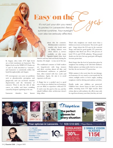 24 | Gazette Life | August 2025It's not just your skin you need to protect in Lanzarote's fierce summer sunshine. Your eyesight can also be seriously affected.In August, ultra violet (UV) light levels are at their maximum on Lanzarote. The highest levels on the WHO's UV Index are 11 and 12, both described as %u201cextreme%u201d, and Lanzarote is consistently within this band throughout July and August.UV overexposure can cause eye problems such as photokeratitis, pterygium, and pinguecula; and can accelerate macular degeneration and the formation of cataracts. There is also the risk of skin cancer on eyelids, and faster wrinkling caused by frequent squinting in the sun.Lanzarote islanders have known about this for centuries. Holidaymakers sometimes wonder why locals insist on dining indoors even when there's a terrace available, or why many Spanish homes close their shutters and stay dark and shady during the daytime. It's simple %u2013 to stay out of the sun.The traditional costumes of field workers are long-sleeved, with long trousers and skirts covering almost all skin, and wide-brimmed sombreros or palm-leaf hats, often teamed with face scarfs and bandannas. Again, the aim is to avoid exposure at all costs.A floppy hat or a peaked cap is a good way to keep eyes shaded, but on Lanzarote you are likely to experience reflected UV if you're near the pool or the sea, and the island's brilliant white architecture doesn't help, either.GAZETTE | HEALTHEasy on theEyesThat's why sunglasses are much more than a fashion accessory on Lanzarote. You need a good pair %u2013 forget about the %u20ac10 ones in the souvenir shops, and look for good quality UV protective sunglasses that block out 99 to 100 percent of both UV-A and UV-B radiation. Wrap-around shades are the best, but any good pair will hugely increase protection.Don't forget that the level of protection given by sunglasses has nothing to do with their darkness. Darker glasses can help soothe tired or sore eyes, but they do not increase UV protection.While summer is the worst time for sun damage, on Lanzarote it's very much a year-round risk. In winter, sunlight arrives at lower angles, making sunglasses vital for driving and outdoor activities.Finally, make sure children are protected. Children have clearer lenses in their eyes than adults, meaning more UV light reaches their retinas. Just as with sunburn, the effects may only be experienced many years later, but they are real.