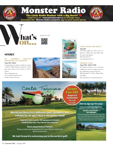 36 | Gazette Life | August 2025on...hat%u2019sScan for more eventsSPORTXII CARRERA POPULAR BARRANCO DEL QU%u00cdQUERE Aug 2nd, 10amA community race that sees athletes compete in 5km & 10km distances along the coastal path from Puerto del Carmen to Puerto Calero.More information at:www.cronolinecanarias.comVaradero, Puerto del Carmen.HAR%u00cdA MUSIC RUN NIGHTAug 9thThe Haria night race will see races of distances 1.6km, 5km and 10km with live music throughout.More information at: www.tripasioneventos.comFAMARA TOTALAug 14th, 15th & 16thThe Famara Total race is a trail and trekking race that sees athletes take on the challenging terrain in Famara. With distances of 7.5km, 15km, 25km and 50km.More information at www.famaratotal.comWould you like to try a di%u0012erent sport, outdoors, and suitable for all ages? Now is the perfect time! Beginner Golf Courses. All equipment included Small group sizes. You choose the schedule! Never played before? Perfect! These courses are designed just for you. All you need is the desire to have fun. We look forward to welcoming you to the world of golf! How to sign up? It%u2019s easy: Go to www.descubreelgolf.comSelect the course on the map and click \ APUNTARME\\.Choose the group that best suits you (Ycan come with friends or family!). Make the payment by card & you%u2019ll receive an email with confirmation and course details.outoorsandHow to signGo to www.desSelect the course o\ AP\Green Fee 58%u20acAugust & SeptemberUse CodeTG1608