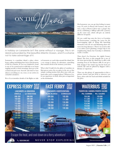 August 2025 | Gazette Life | 37A holiday on Lanzarote isn't the same without a voyage. This is an island surrounded by the beautiful Atlantic Ocean, and it's a shame not to take advantage of it.Lanzarote is a maritime island, a place where boats, sailing and fishing have been vital elements of life for centuries. If you ever doubted it, head to any of its coastal towns at full tide to see boats tugging merrily at their moorings, then go to the commercial port near Arrecife and observe how almost everything we eat, wear, or use arrives in colourful containers. Few of us remember details of the flights we take to Lanzarote or coach trips around the island, but a sea voyage is always an adventure, something that remains fresh in the memory years later.Why is this? Could it be the glitter of sunshine on blue-green water, the sea spray in the air, or that unique rocking motion that often stays with you hours after you've stepped ashore? Whatever it is, it's an experience in itself, often just as important as the destination.ON THEOn Lanzarote you can get that feeling in many ways. If you're in Puerto del Carmen, why not turn a trip to Puerto Calero into a proper day out by combining a clifftop walk with a journey on the water taxi, which will give an entirely different viewpoint.Or you could hop onto the ferry to Corralejo in Fuerteventura, watching the waves for the heart-stopping sight of flying fish launching themselves into the air and skimming above the waves for long distances. There's no need to take a car unless you're planning a longer trip to our neighbouring island, but Corralejo is definitely worth a wander.Then there's La Graciosa, the eighth Canary Island. The ferry to this unspoilt isle is one of the most spectacular the island has to offer, with stunning views of the Famara cliffs. It can get a little choppy if the wind is up, but the boats are entirely safe and are piloted by skippers with a lifetime of experience.There are also plenty of opportunities to hire a private charter and just head to wherever you fancy, often with the food and drink included in the price.Waves