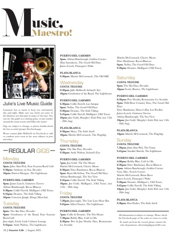 38 | Gazette Life | August 2025Music,Julie%u2019s Live Music GuideREGULAR GIGSLanzarote has so much to keep you entertained, day and night. Make sure you check out some of the fabulous acts that play in many of the bars. You can use this guide as a starting point, or just wander around the main resorts and follow the music! Gigs are subject to change, so please double-check the bar or artist/group%u2019s Facebook page. Please contact Julie Helliwell via Facebook to add or confirm your event in the next edition (in print and online).Maestro!MondayCOSTA TEGUISE9pm: John Alan Pick, Four Seasons Rock Caf%u00e99.30pm: Anthony on Sax, Decades10pm: Darren Morgan, The LighthousePUERTO DEL CARMEN9pm: James Lynch, Guinness TavernAdrian Bambrough, Rocas Blancas9.30pm: Collie Farrell, Mulligan%u2019s (Old Town)9.45pm: Deanne, The Irish Viking10pm: Concrete Jungle, Kings (Mon-Sat)TuesdayCOSTA TEGUISE8pm: The Ska Duo, Decades9pm: Gentlemen of the Road, Four Seasons Rock Caf%u00e9Jam night, Lively Lady Cabaret Lounge9.45pm: Andy Walton, The LighthousePUERTO DEL CARMEN9pm: Adrian Bambrough, Golden CornerMax Santalucia, The Good Old DaysJames Lynch, Finnegan%u2019s WakePLAYA BLANCA9.30pm: Martin McCormack, The Old MillWednesdayCOSTA TEGUISE9.30pm: Julie Helliwell, Ireland%u2019s Eye10pm: Gentlemen of the Road, The LighthousePUERTO DEL CARMEN6.30pm: Collie Farrell, Las Amigas9pm: Nolita, The Good Old Days9.30pm: Deanne, The Irish Viking9.45pm: Collie Farrell, Mulligan%u2019s (Old Town)10pm: Jon Gold, Murphy%u2019s Irish Pub (not 15th %u2013 28th Aug)PLAYA BLANCA9.30pm: Mara, The Irish Anvil10pm: Martin McCormack, The FlagshipThursdayCOSTA TEGUISE6pm: The Ska Duo, Decades9.30pm: Andy Walton, Ireland%u2019s EyePUERTO DEL CARMEN7pm: Jon Gold, The Fire HouseMartin McCormack, Cherry Moon8.30pm: Dave Bandanna, Rocas Blancas 9pm: Ryan McArthur, The Good Old DaysAdrian Bambrough, The Sea View9.45pm: Collie Farrell, The Irish Viking10pm: Jon Gold, Mulligan%u2019s, (Old Town) (not 15th %u2013 28th Aug)FridayCOSTA TEGUISE7.30pm: Jam night, The Late Late Show Bar9.45pm: Abba Classics, The LighthousePUERTO DEL CARMEN7pm: Collie & Deanne, The Fire House7.30pm: Bobby Blue, Caf%u00e9 la Ola8.30pm: Pete & Jan Worthy Duo, Restaurante La AvenidaAll information is subject to change. Please check the Facebook page of the artist or venue to verify.To stand out from the crowd, please contact the sales department: advertising@gazettelife.comMartin McCormack, Cherry MoonDave Bandanna, Rocas Blancas 9pm: Nolita, The Good Old Days9.30pm: Deanne, Mulligan%u2019s (Old Town)SaturdayCOSTA TEGUISE9pm: The Ska Duo, Decades10pm: Scotty Barnes, The LighthousePUERTO DEL CARMEN8.30pm: Pete Worthy, Restaurante La Avenida9pm: Wild Rose Country Duo, The Good Old DaysDave Bandanna, Marco%u2019s Bar, Los PocillosJames Lynch, Guinness TavernAdrian Bambrough, The Sea View10pm: Jon Gold, Murphy%u2019s Irish Pub (not 15th %u2013 28th Aug)PLAYA BLANCA10pm: Martin McCormack, The FlagshipSundayCOSTA TEGUISE7.30pm: John Alan Pick, The Venue 9.45pm: Smokin%u2019 Barrels, The LighthousePUERTO DEL CARMEN4:30pm: Bobby Blue, Caf%u00e9 la Ola8.30pm: Dave Bandanna, Rocas Blancas9pm: Adrian Bambrough, Golden CornerGary Mac, Scotch CornerMartin McCormack, Brian BoruJames Lynch, Finnegan%u2019s Wake9.30pm: Deanne, Mulligan%u2019s, (Old Town)9.45pm: Collie Farrell, The Irish Viking10pm: Jon Gold, Murphy%u2019s Irish Pub (not 15th %u2013 28th Aug)PLAYA BLANCA9.30pm: Don Parker, The Irish Anvil