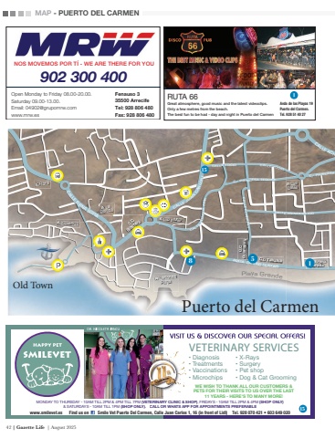 42 | Gazette Life | August 2025VETERINARY SERVICESwww.smilevet.es Find us on Smile Vet Puerto Del Carmen, Calle Juan Carlos 1, 16 (in front of Lidl) Tel. 928 070 421 %u2022 603 649 020 MONDAY TO THURSDAY - 10AM TILL 2PM & 4PM TILL 7PM (VETERINARY CLINIC & SHOP), FRIDAYS - 10AM TILL 2PM & 4PM (SHOP ONLY) & SATURDAYS - 10AM TILL 1PM (SHOP ONLY). - CALL OR WHATS APP FOR APPOINTMENTS PREFERABLEVLL 7PM(VETERINARY CLINIC & SHOPOP ONLY).CALL OR WHATSAPP FOR%u2022 Diagnosis %u2022 Treatments %u2022 Vaccinations %u2022 Microchips%u2022 X-Rays%u2022 Surgery %u2022 Pet shop %u2022 Dog & Cat Grooming WE WISH TO THANK ALL OUR CUSTOMERS &PETS FOR THEIR VISITS TO US OVER THE LAST11 YEARS - HERE'S TO MANY MORE!CALLE TOGIOC.CBiosferaLanzarotePrincessCALLEACAVDA.DELASPLAYASCALEJUANCARLOSICALLEREINASOFCALLETOGIOCALLEPRINCESAC/PRINCESATEGUISEC/PRINCECALLE GUANAPAYCALLEC.C ArenaDoradaC.C TabaibaC.CGuanapayA LasCalasA Luz y MarH FarionesPlayaA FloraA FloraA LaFloridaA AquariusPlayaGrandeC.CBiosfesfC.CBiosferaC.CArenaDoradaC.C ArenaDoradaASPLAYC.C TabaibaC.C TabaibaC.CGuanapayC.CGuanapayA LasCalasA LasCalasA LuzyMaA Luz y MarHFarionesPlayaH FarionesPlayaA LaFloridA LaFloridaA uariusPuerto del CarmenOld Town15MAP - PUERTO DEL CARMEN81Avda de las Playas 19Puerto del Carmen.Tel. 928 51 40 27 RUTA 66Great atmosphere, good music and the latest videoclips.Only a few metres from the beach.The best fun to be had - day and night in Puerto del Carmen1Fenauso 335500 ArrecifeTel: 928 806 480Fax: 928 806 480Open Monday to Friday 08.00-20.00.Saturday 09.00-13.00.Email: 04902@grupomrw.comwww.mrw.esNOS MOVEMOS POR T%u00cd - WE ARE THERE FOR YOU902 300 400