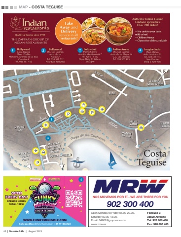 48 | Gazette Life | August 2025 Calle Las Olas(Behind Kalima bar) +34 711066123 WWW.FUNKYMINIGOLF.COM OPENING HOURS 10AM - 11PM OPEN EVERY DAY!A OasisLanzH Be LiveTeguisePlayaA NazaretANazaA reNazatH ZocosH SandsBeachH MeliaSalinasA SolA FicusPlayaeasCucharasAVDA. DEL MARAVDA. DE LAS PALMERASAVDA. DE LAS PALMERASAVDA. DE JABLILLOAVDA. DE JABLILLOAVDA.DELASISLASCCALLE LOS DRAGOSC.C LasCucharasPlayalosCcosA OasiLanzA OasisLanzHBeLTeguisPlayaH Be LiveTeguisePlayaH BeatrizCosta & SpaHBeatrizCosta &SpaH BeatrizCosta & SpaH ZocoH ZocosHSandBeacH SandsBeachH MeliaSalinasH MeliaSalinasA SolA FicusVDA FicusH Be LiveLanzaroteExperienceBeachHBeLiveLanzaroteExperienceBeachH Be LiveLanzaroteExperienceBeachPUNTA JABLILLOPUNTAJABLILLLOPUNTA JABLILLOUNTAJABretPuebloMarineroAVDA. DE LAS ISLAS CANARIAS1Costa TeguiseMAP - COSTA TEGUISE1325444Fenauso 335500 ArrecifeTel: 928 806 480Fax: 928 806 480Open Monday to Friday 08.00-20.00.Saturday 09.00-13.00.Email: 04902@grupomrw.comwww.mrw.esNOS MOVEMOS POR T%u00cd - WE ARE THERE FOR YOU902 300 400