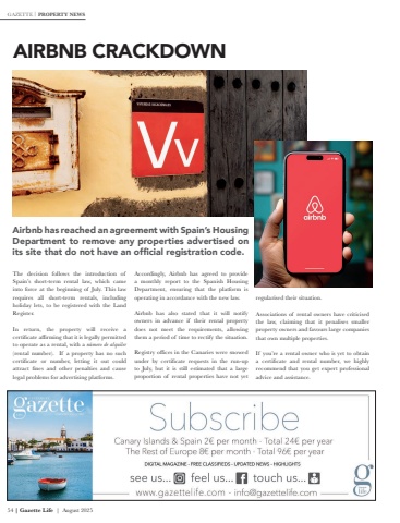 54 | Gazette Life | August 2025AIRBNB CRACKDOWNAirbnb has reached an agreement with Spain%u2019s Housing Department to remove any properties advertised on its site that do not have an official registration code.The decision follows the introduction of Spain%u2019s short-term rental law, which came into force at the beginning of July. This law requires all short-term rentals, including holiday lets, to be registered with the Land Register.In return, the property will receive a certificate affirming that it is legally permitted to operate as a rental, with a n%u00famero de alquiler(rental number). If a property has no such certificate or number, letting it out could attract fines and other penalties and cause legal problems for advertising platforms.Accordingly, Airbnb has agreed to provide a monthly report to the Spanish Housing Department, ensuring that the platform is operating in accordance with the new law.Airbnb has also stated that it will notify owners in advance if their rental property does not meet the requirements, allowing them a period of time to rectify the situation.Registry offices in the Canaries were snowed under by certificate requests in the run-up to July, but it is still estimated that a large proportion of rental properties have not yet regularised their situation. Associations of rental owners have criticised the law, claiming that it penalises smaller property owners and favours large companies that own multiple properties.If you%u2019re a rental owner who is yet to obtain a certificate and rental number, we highly recommend that you get expert professional advice and assistance.GAZETTE PROPERTY NEWS