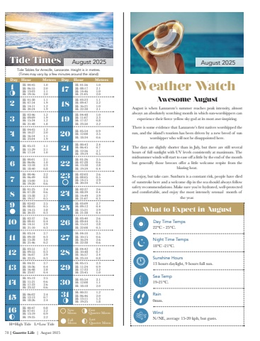 78 | Gazette Life | August 2025Tide Tables for Arrecife, Lanzarote. Height is in metres. (Times may vary by a few minutes around the island)Tide TimesAugust 2025Awesome August August is when Lanzarote%u2019s summer reaches peak intensity, almost always an absolutely scorching month in which sun-worshippers can experience their fierce yellow sky god at its most awe-inspiring.There is some evidence that Lanzarote%u2019s first natives worshipped the sun, and the island%u2019s tourism has been driven by a new breed of sun worshipper who will not be disappointed here. The days are slightly shorter than in July, but there are still several hours of full sunlight with UV levels consistently at maximum. The midsummer winds will start to ease off a little by the end of the month but generally those breezes offer a little welcome respite from the blazing heat. So enjoy, but take care. Sunburn is a constant risk, people have died of sunstroke here and a welcome dip in the sea should always follow safety recommendations. Make sure you%u2019re hydrated, well-protected and comfortable, and enjoy the most intensely sensual month of the year. August 2025H: H: H: 00:45 06:55 13:03 1.02.01.1Weather WatchH: 19:16 2.0H: 01:38 1.1H: 07:54 1.9H: 14:11 1.2H: 20:24 1.9H:02:46 1.2H: 09:09 1.9H: 15:34 1.2H: 21:48 1.8H:04:05 1.2H: 10:27 2.0H: 16:54 1.1H: 23:04 1.9H: 05:13 1.1H: 11:29 2.1H: 17:54 1.0H:00:01 2.1H: 06:06 1.0H: 12:18 2.3H: 18:40 0.8H: 00:46 2.2H: 06:49 0.8H: 13:00 2.5H: 19:20 0.6H:01:25 2.4H: 07:28 0.6H: 13:38 2.7H: 19:57 0.5H: 02:02 2.5H: 08:05 0.5H: 14:15 2.8H: 20:33 0.3H: 02:37 2.6H: 08:41 0.4H: 14:51 2.9H: 21:10 0.3H:03:14 2.7H: 09:18 0.3H: 15:28 3.0H: 21:46 0.2H:03:51 2.7H: 09:55 0.3H: 16:07 2.9H: 22:25 0.3H: 04:31 2.7H: 10:36 0.4H: 16:48 2.8H: 23:07 0.4H: 05:13 2.5H: 11:21 0.6H: 17:33 2.6H: 23:52 0.6H: 06:02 2.4H: 12:13 0.7H: 18:26 2.4H: 00:47 0.8H: 07:01 2.2H: 13:19 0.9H: 19:35 2.2171819202122232425262728293031H: 01:56 1.0H: 08:17 2.1H: 14:46 1.0H: 21:05 2.0H: 03:23 1.1H: 09:47 2.2H: 16:21 1.0H: 22:38 2.1H: 04:48 1.0H: 11:07 2.3H: 17:37 0.8H: 23:50 2.2H: 05:54 0.9H: 12:08 2.5H: 18:34 0.6H:00:43 2.4H: 06:45 0.7H: 12:56 2.7H: 19:19 0.5H: 01:26 2.5H: 07:28 0.6H: 13:38 2.8H: 19:59 0.4H: 02:03 2.6H: 08:05 0.5H: 14:15 2.9H: 20:34 0.3H: 02:37 2.6H: 08:39 0.4H:14:49 2.9H: 21:07 0.3H: 03:09 2.7H: 09:12 0.4H: 15:21 2.9H: 21:38 0.4H: 03:40 2.6H: 09:44 0.5H: 15:53 2.8H: 22:08 0.5H: 04:10 2.5H: 10:15 0.6 H: 16:24 2.6H: 22:38 0.6H: 04:42 2.4H: 10:48 0.7H: 16:57 2.4H: 23:10 0.8H:05:15 2.3H: 11:24 0.9H: 17:33 2.2H: 23:45 1.0H:05:54 2.1H: 12:08 1.1H: 18:18 2.0H: 00:31 1.2H: 06:46 2.0H: 13:11 1.3H: 19:25 1.8DayHourMetres DaHourMetresH=High Tide L=Low TideLastQuarter MoonNew MoonFull MoonFirstQuarter Moon12345678910111213141516What to Expect in AugustDay Time Temps22%u00b0C - 25%u00b0C.Night Time Temps18%u00b0C -21%u00b0C.Sunshine Hours13 hours daylight, 9 hours full sun. Sea Temp19-21%u00b0C.Rain 0mm.WindN/NE, average 15-20 kph, but gusts.