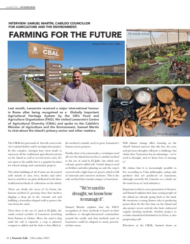 10 | Gazette Life | December 2025GAZETTE | INTERVIEWFARMING FOR THE FUTURE Last month, Lanzarote received a major international honour in Rome after being recognised as a Globally Important Agricultural Heritage System by the UN%u2019s Food and Agriculture Organisation (FAO). We visited Lanzarote%u2019s Centre of Agricultural Diversity (CBAL) and spoke to the Cabildo%u2019s Minister of Agriculture and the Environment, Samuel Mart%u00edn to chat about the island%u2019s primary sector and other matters.The CBAL lies just north of Arrecife, next to the city%u2019s animal shelter, and is an impressive project. In this complex, attempts have been made to represent all the traditional agricultural systems on the island as well as several newer ones. It%u2019s not open to the public but is a popular location for school outings and community projects. The white buildings of the Centre are decorated with murals of ants, bees, beetles and other insects, and there are plots dedicated to the three traditional methods of cultivation on the island. These are, firstly, the zocos of La Geria, the famous method of growing vines that involves digging a deep pit in the volcanic soil and building a horseshoe-shaped wall to protect the vine from the wind.Then there is the use of sand in El Jable, the sandy central corridor of Lanzarote stretching from Famara to G%u00fcime. Here, the sand is dug until the soil is exposed, a crop is planted, compost is added and the hole is then filled in. his method is mainly used to grow Lanzarote%u2019s famous sweet potatoes. Finally, there is los enarenados, a technique used all over the island that involves a similar method to the use of sand in El Jable, but which uses volcanic gravel called rofe. Camel dung is used as fertiliser and after planting on soil, the crop is covered with a light layer of gravel, which is full of minerals and conserves moisture. This is the only method that remains unique to Lanzarote.Samuel Mart%u00edn explains that the FAO%u2019s recognition of these methods is based on their usefulness to drought-threatened communities around the world, and that methods used on Lanzarote could be adapted to many povertystricken areas.Will climate change affect farming on the island? Samuel answers that this hot, dry year, and previous droughts will pose a challenge, but claims that %u201cLanzarote has an advantage %u2013 we%u2019re used to drought, and we know how to manage it.%u201dHe claims that it is increasingly possible to live according to 0 km philosophy, eating only products that are produced on Lanzarote, although currently the Canaries as a whole are the main focus of such initiatives. Important to this is a new generation of farmers, and Samuel explains that some young people on the island are already going back to the land. He mentions a young farmer who is producing potato flour for the first time on the island and also praises newer arrivals who have embraced organic farming methods. Another project, to reclaim abandoned farmland in la Geria, is also progressing well. Elsewhere at the CBAL, Samuel shows us INTERVIEW: SAMUEL MART%u00cdN, CABILDO COUNCILLOR FOR AGRICULTURE AND THE ENVIRONMENT. %u201cWe%u2019re used to drought, we know how to manage it%u201d. Samuel Mart%u00edn at the CBAL.The butterfly enclosure.Part of the seed bank.