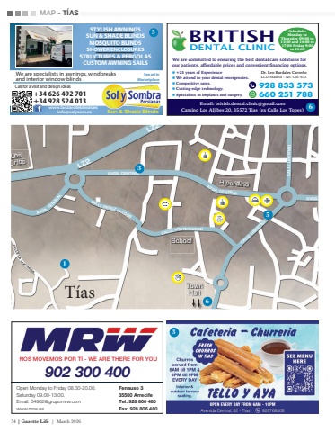54 | Gazette Life | March 2026AVDA. CENTRALTownHallAVDA. CENTRALAVDA. CENTRALAVDA. CENTRALAVDA. CENTRALAVDA. CENTRALAVDA. CENTRALLZ2LZ2LZ2LZ2CALLE LIBERTADCALLE LIBERTADCALLE SAN BLASCALLE SAN BLAS CALLE CANDLosLiriosMACHERYAIZAARRECIFESchoolTownHallTownHallLosLiriosLosLiriosFerreter%u00edaDIY storeFerreter%u00edaDIY store Ferreter%u00edaDIY storeSchoolCALLE FRATERNIDADCALLE PEREZ GALD%u00d3SHiperdinoCEHiperdino iperdinoCALLE LALUCHADAT%u00edas31+34 626 492 701+34 928 524 013 www.lanzaroteblinds.es info@solysom.es Sun & Shade BlindsCall for a visit and design ideasWe are specialists in awnings, windbreaks and interior window blindsSTYLISH AWNINGSSUN & SHADE BLINDSMOSQUITO BLINDSSHOWER ENCLOSURESSTRUCTURES & PERGOLASCUSTOM AWNING SAILSSee ad in Marketplace56MAP - T%u00cdAS928 833 573 Dr. Leo Bardales Carre%u00f1o LCD Madrid - No. Col: 672Email: british.dental.clinic@gmail.comCamino Los Aljibes 20, 35572 Tias (ex Calle Los Topes)BRITISHDENTAL CLINICWe are committed to ensuring the best dental care solutions forour patients, affordable prices and convenient financing options.fi +25 years of Experiencefi We attend to your dental emergencies.fi Competitive rates.fi Cutting-edge technology.fi Specialists in implants and surgery.Schedule:Monday toThursday 09:00 to13:00 and 14:00 to17:00 Friday 9:00to 13:00660 251 788 653Fenauso 335500 ArrecifeTel: 928 806 480Fax: 928 806 480Open Monday to Friday 08.00-20.00.Saturday 09.00-13.00.Email: 04902@grupomrw.comwww.mrw.esNOS MOVEMOS POR T%u00cd - WE ARE THERE FOR YOU902 300 400