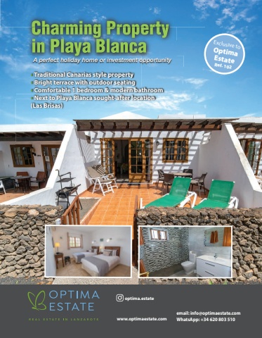 March 2026 | Gazette Life | 57optima.estateemail: info@optimaestate.comWhatsApp: +34 620 803 510%u2022 Traditional Canarias style property%u2022 Bright terrace with outdoor seating%u2022 Comfortable 1 bedroom & modern bathroom%u2022 Next to Playa Blanca sought-after location (Las Brisas)www.optimaestate.comCharming Property in Playa Blanca%u2022 Next to Playa Blanca sought-after location%u2022 Traditional Canarias style property%u2022 Bright terrace with outdoor seating%u2022 Comfortable 1 bedroom & modern bathroomA perfect holiday home or investment opportunityExclusive to Optima EstateRef. 102