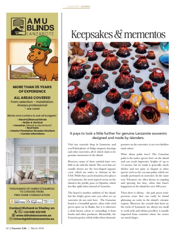 60 | Gazette Life | March 2026GAZETTE | LIVINGIt pays to look a little further for genuine Lanzarote souvenirs designed and made by islanders. Visit any souvenir shop in Lanzarote and you%u2019ll find plenty of fridge magnets, keyrings and other souvenirs, all of which claim to be genuine mementos of the island. However, many of these symbols have very little to do with the island. The cacti that are usually shown are the tree-shaped saguaro cacti, which are native to Arizona in the USA. While they can be found in a few places on Lanzarote, the most typical cactus on the island is the prickly pear, or Opuntia, which has flat, spiky lobes instead of branches.The lizard is another emblem of the island, but the bright green ones you often see on souvenirs do not exist here. The Canarian lizard is a beautiful species, often with vivid green spots on its flanks, but it is otherwise a drab brown colour to camouflage it from hawks and other predators. Meanwhile, the Canarian gecko, which strikes those dramatic postures on the souvenirs, is an even drabber mud colour. What about palm trees? The Canarian palm is the native species here on the island and can reach impressive heights of up to 13 metres, but its trunk is generally much thicker and not quite as elegant as other species such as the coconut palm, which are usually portrayed on souvenirs. In the same way. Volcanoes are often shown as erupting and spewing hot lava, when that hasn%u2019t happened on the island for over 200 years. Then there is olivina %u2013 the pale green semiprecious stone that can easily be found glistening on rocks in the island%u2019s volcanic regions. However, the crystals that form on the rocks of Lanzarote are always too small to work with and olivina jewellery is usually imported from countries where the stones are much larger. Keepsakes & mementos%u2022 Electric/Manual blinds%u2022 Roller & Vertical%u2022 Venetian (Wood & Aluminium)%u2022 Roof Sails%u2022 Interior Plantation Wooden Shutters%u2022 Curtain AlterationsTHOUSANDS OF FABRICS/SAMPLES TO CHOOSE FROM.FREE HOME CONSULTATIONContact Richard or Shelley on +34 686 332 015 www.blindslanzarote.es richard@blindslanzarote.esMORE THAN 35 YEARS OF EXPERIENCE ALL AREAS COVEREDFrom selection - installation. Always professional - we care! Blinds and curtains to suit all budgets!
