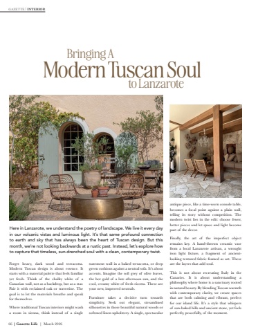 66 | Gazette Life | March 2026GAZETTE | INTERIORHere in Lanzarote, we understand the poetry of landscape. We live it every day in our volcanic vistas and luminous light. It%u2019s that same profound connection to earth and sky that has always been the heart of Tuscan design. But this month, we%u2019re not looking backwards at a rustic past. Instead, let%u2019s explore how to capture that timeless, sun-drenched soul with a clean, contemporary twist.Forget heavy, dark wood and terracotta. Modern Tuscan design is about essence. It starts with a material palette that feels familiar yet fresh. Think of the chalky white of a Canarian wall, not as a backdrop, but as a star. Pair it with reclaimed oak or travertine. The goal is to let the materials breathe and speak for themselves.Where traditional Tuscan interiors might wash a room in sienna, think instead of a single statement wall in a baked terracotta, or deep green cushions against a neutral sofa. It%u2019s about accents. Imagine the soft grey of olive leaves, the hot gold of a late afternoon sun, and the cool, creamy white of fresh ricotta. These are your new, improved neutrals.Furniture takes a decisive turn towards simplicity. Seek out elegant, streamlined silhouettes in those beautiful natural woods or softened linen upholstery. A single, spectacular Bringing AModern Tuscan Soulantique piece, like a time-worn console table, becomes a focal point against a plain wall, telling its story without competition. The modern twist lies in the edit: choose fewer, better pieces and let space and light become part of the decor.Finally, the art of the imperfect object remains key. A hand-thrown ceramic vase from a local Lanzarote artisan, a wrought iron light fixture, a fragment of ancientlooking textured fabric framed as art. These are the layers that add soul.This is not about recreating Italy in the Canaries. It is about understanding a philosophy where home is a sanctuary rooted in natural beauty. By blending Tuscan warmth with contemporary clarity, we create spaces that are both calming and vibrant, perfect for our island life. It%u2019s a style that whispers of sun-baked hills and ancient stone, yet feels perfectly, peacefully, of the moment.to Lanzarote