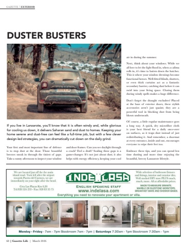 68 | Gazette Life | March 2026GAZETTE | EXTERIORIf you live in Lanzarote, you%u2019ll know that it is often windy and, while glorious for cooling us down, it delivers Saharan sand and dust to homes. Keeping your home serene and dust-free can feel like a full-time job, but with a few clever design-led strategies, you can dramatically cut down on the daily grind.Your first and most important line of defence is to stop dust at the door. Those beautiful breezes sneak in through the tiniest of gaps. Take a sunny afternoon to inspect your window and door frames. Can you see daylight through a crack? Feel a draft? Sealing these gaps is a game-changer. It%u2019s not just about dust; it also helps with energy efficiency, keeping your cool DUSTER BUSTERSair in during the summer.Next, think about your windows. While we all love to let the light flood in, when a calima rolls in, it%u2019s time to batten down the hatches. This is where your window dressings become functional heroes. Well-fitted blinds, shutters, or even thick curtains act as a fantastic secondary barrier, catching dust before it can swirl into your living space. Closing them during windy spells makes a huge difference.Don%u2019t forget the draught excluders! Placed at the base of exterior doors, these stylish accessories aren%u2019t just quaint; they are a powerful tool in blocking dust from being blown underneath. Of course, a little regular maintenance goes a long way. A quick, dry microfiber cloth is your best friend for a daily once-over on surfaces, as it traps dust instead of just redistributing it. And remember, a doormat at every entrance, inside and out, encourages everyone to wipe their feet too.Embrace these tips, and you can spend less time dusting and more time enjoying the beautiful, breezy Lanzarote lifestyle.