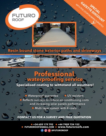March 2026 | Gazette Life | 69Professional waterproofing serviceSpecialised coating to withstand all weathers!Professional waterproofing serviceSpecialised coating to withstand all weathers!%u25c6 Waterproof guarantee %u25c6 UV resistant%u25c6 Reflects sun rays to reduce air conditioning costs and increasing solar panels performance%u25c6 Multi layer system with 4 coats%u25c6 Waterproof guarantee %u25c6 UV resistant%u25c6 Reflects sun rays to reduce air conditioning costs and increasing solar panels performance%u25c6 Multi layer system with 4 coatsCONTACT US FOR A SURVEY AND FREE QUOTATIONSPECIAL GAZETTE DISCOUNT WITH THIS COUPON WHEN SURVEYED%u25c6 +34 659 179 792 %u25c6 +44 7909 724 152%u25c6 FUTUROROOF@GMAIL.COM %u25c6 www.futuroroofs.com@FUTUROROOF Resin bound stone exterior paths and driveways
