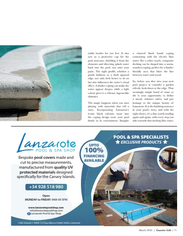 March 2026 | Gazette Life | 71stable border for wet feet. It also acts as a protective cap for the pool structure, shielding it from the elements and directing splash water back into the pool, not onto your patio. The right profile, whether a gentle bullnose or a sleek squared edge, not only feels better to sit on but also influences the water%u2019s visual effect. A darker coping can make the water appear deeper, while a light colour gives it a vibrant, lagoon-like shimmer.The magic happens when you start playing with materials that tell a story. Incorporating Lanzarote%u2019s iconic black volcanic stone into the coping design roots your pool firmly in its environment. Imagine a charred black basalt coping contrasting with the electric blue water. For a softer touch, composite decking can be shaped into a warm, seamless coping, perfect for a familyfriendly area that blurs the line between water and wood.So, before you dive into your next pool project or consider a garden refresh, look down at the edge. That seemingly simple band of stone or tile is your opportunity to define a mood, enhance safety, and pay homage to the unique beauty of Lanzarote. It is the finishing sentence in your pool%u2019s story, and with the right choice, it%u2019s a line worth reading again and again, with every step you take towards that inviting blue water.fifffffflffiflffi%u001afi%u0019ffi%u001afi%u0018%u0017%u0016%u0019ffl%u0016%u001a%u0015%u001afifffflffifl%u001a%u0019%u0018fi%u0017%u0016%u0015%u0014%u0013flffl%u0012%u001afifffflffifl%u001afffifffflfflffififlffl%u001a%u0019%u0018%u0017%u0019%u0018%u0017%u0016ff%u0019%u0017%u0015%u0016%u0019%u0014%u0013%u0012%u0019%u0012fl%u0019ffi%u0011ff%u0014%u0010fflff%u0019%u0018ff%u0017ffl%u0013%u0011ff%u0018ff%u0015%u0012ffl%u000f%u0019%u0018%u0017%u0015%u0013%u000e%u0017%u0014%u0012%u0013%u0011ff%u0016%u0019%u000e%u0011fl%u0018 %u0016%u0015%u0014ffi%u0013%u0012%u0011fi%u0010%u000ffiff%u0018ffl%u0012%u0019fl%u0012%u0019%u000efi%u0014%u0012%u0019%u0018%u0013%u0014ffi%u0017%u0019%u0016ffffl%u0010%u0015ff%u0016%u0019fflffiff%u0014%u0010%u000c%u0014%u0017%u000b%u000b%u0019%u000efl%u0011%u0019%u0012%u0009ff%u0019%u0008%u0017%u0015%u0017%u0011%u0019%u0007ffl%u000b%u0017%u0015%u0016ffl%u0006%u0019%u0019%u000cff%u0019%u000bfi%u000c%u0009%u0008%u0007%u0006fi%u0012fflfi%u0005%u0004%u0003%u0008%u0007%u0006fi%u0005%u0004%u0003%u0019%u0012%u0010%u000b%u000b%u0019%u0001%u0003%u0019%u0019%u0008%u0017%u000b%u000bff%u0019%u0013%u0011%u0081%u0013%u0010%u0017%u0019%u008d%u000f%u0019%u008f%u0004%u0090%u009d%u0019%u008d%u00a0%u000f%u0019%u0001%u000b%u0017%u0017%u0019fi%u000b%u0017%u0015%u0014%u0017%u0019%u00ad%u0080%u0082%u000f%u0019%u0083%u0004%u0007%u0084%u0004%u000f%u0019%u0085%u0017%u0015%u0086%u0017%u0011fl%u0012fffifififffflffifl%u001affi%u0019%u0018%u0017%u0016%u0015%u0018%u0018ffl%u0014%u0013%u0018%u0015ff%u0012%u0018%u0011%u0010%u0019%u0010%u0015%u000efl%u0087%u000b%u0017%u0015%u0086%u0017%u0011fl%u0012ffffiflfl%u000bffl%u0009flffi%u0006%u0014fl%u0018%u0085%u0017%u0015%u0086%u0017%u0011fl%u0012ff%u0019%u0001flfl%u000b%u0019%u0088%u0019%u0089ffi%u0017%u0019%u0089%u0009flffi%u0019%u0001%u0081fi%u008d%u008f%u0090fi%u009d%u00a0%u0090fi%u008d%u0090%u00adfi%u0014fi%u0015ff%u0013%u0012%u0012%u0011ffi%u0010%u0016%u000f%u0019%u000f%u0017%u0016%u000f%u000effi%u0019%u0019%u0016ffl%u0019%u000cffl%u0018