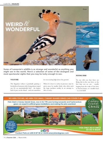 74 | Gazette Life | March 2026GAZETTE | WILDLIFEVULTUREThe Egyptian vulture is gradually gaining a foothold on Lanzarote after being almost wiped out. It%u2019s an unmistakeable bird %u2013 the largest bird of prey on the island %u2013 and can sometimes be seen soaring high above the ground. When it%u2019s closer to earth, its presence may be given away by smaller birds, who often mob the large predator noisily, in an attempt to drive it away. WEIRD WONDERFULSome of Lanzarote%u2019s wildlife is as strange and wonderful as anything you might see in the world. Here%u2019s a selection of some of the strangest and most spectacular sights that you may be lucky enough to see. FLYING FISHNo one tells you that there are flying fish in the seas here, so the first time you see one %u2013 usually leaping from the wake of the ferry to Fuerteventura, or a smaller boat %u2013 is a real thrill.HoopoeFlying fishVulture&Pete Clark is Canary Islands Grass, now in his 19th year turning Lanzarote and Fuerteventuragreen; an expert in artificial grass installations and making the joins seamless!Contact Pete on 658 25 87 82 or info@canaryislandsgrass.com'YOU ONLY DO IT ONCE SO DO IT RIGHT'Premium quality grass at affordable prices with a 10 year guaranteeNO AREA TOO BIG, NO AREA TOO SMALL, CANARY ISLANDS GRASS CAN COVER IT ALL!