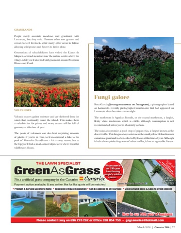 March 2026 | Gazette Life | 77GRASSLANDSPeople rarely associate meadows and grasslands with Lanzarote, but they exist. Farmers often sow grasses and cereals to feed livestock, while many other areas lie fallow, allowing wild grasses and flowers to thrive alone.Generations of schoolchildren have visited the Llanos de M%u00e1guez, a broad meadow near the nature centre above the village, while you%u2019ll also find wild grasslands around Monta%u00f1a Blanca and Conil.VOLCANOESVolcanic craters gather moisture and are sheltered from the winds that continually comb the island. This makes them a valuable site for plants and many craters will be full of greenery at this time of year.The peaks of volcanoes can also host surprising amounts of plants. If you%u2019re in T%u00edas, we%u2019d recommend a hike to the peak of Monta%u00f1a Guardilama %u2013 it%u2019s a steep ascent, but at the top you%u2019ll find a small, almost alpine area where beautiful wildflowers bloom. Fungi galoreRosa Garc%u00eda (@rosagvnocturnas on Instagram), a photographer based on Lanzarote, recently photographed mushrooms that had appeared on Lanzarote after the rains %u2013 a rare sight.The mushroom is Agaricus litoralis, or the coastal mushroom, a largish, fleshy white mushroom which is edible, although consumption is not recommended unless you%u2019re absolutely certain.The rains also promise a good crop of papas cr%u00edas, a fungus known as the desert truffle. This fungus always exists near the small yellow Helianthemum canariense plant and is often collected by locals at this time of year. Although it lacks the exquisite fragrance of other truffles, it has an agreeable flavour.No.1 artificial grass company in the CanariesPayment option available, & any written like for like quote will be matchedTHE LAWN SPECIALIST%u2022 Product & Service Second to None %u2022 Specialist Unique Installation %u2022 Can be applied to any surface %u2022 Great around pools & Spas to avoid slippingGreenAsGrassPlease contact Lucy on 696 270 282 or Office 928 854 759 - gagcanaries@hotmail.com11 year guaranteeArtificialGrassPlease find us on Facebook eded to any surface %u2022PleaseWe are now in our 19th year transforming people's outside spaces...Now in our 19th year of business Now in our 18th year of business