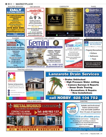 March 2026 | Gazette Life | 81Tel: 628 272 993 or 608 594 870 or Phone 928 836 868Email: lanzadecor@yahoo.com %u2022 www.lanzadecor.comReliable and ProfessionalPainter and DecoratorCity and Guilds QualifiedOver 30 years of experience%u2022 Painting Interior and Exterior %u2022 Wallpapering%u2022 Restaining and varnishing woodwork%u2022 Also available for any household maintenance%u2022 References can be suppliedQuality finish at affordable prices%u2022 All Areas CoveredPAINTINGPAINTING SERVICESTAXESGRILLS AND GATESCARPENTRYMARKETPLACECARPENTRY AND JOINERYKitchen designand installation %u2022 Kitchens %u2022 Bathrooms %u2022 Bedrooms %u2022 Pergolas%u2022 Gates %u2022 Shutters %u2022 Internal & external doors %u2022 Windows %u2022 Bespoke furnitureOver 30 years experiencePlease visit our website Single %u2026. 37 x 58Double %u2026.76 x 58Triple %u2026.116 x 58Lanzarote Drain Services%u2022 Drains Unblocked %u2022 High Pressure Water Jetting %u2022 Camera Surveys & Reports %u2022 Sonar Drain Tracing %u2022 Excavations & Repairs %u2022 New Installationscall NOBBY 628 104 752DRAIN SERVICESSTARLIGHT%u2022 Do you need a carer?%u2022 Do you need a home help?%u2022 Do you need a babysitter?We have a team of quali%u0006ed carers.Reasonable rates.CARE & BABYSITTING SERVICESFor a free assessmentwith no obligationThis is a registered company G35794155Please contact us on636 582 076Email: starlightservicesscp@yahoo.comCARE SERVICES%u2022 Property Renovations%u2022 Kitchens %u2022 Bathrooms%u2022 PoolsContact Julian +34 637 832 982Email: julian.wray@gmail.comVisit www.lanzarote-builders.comBUILDING SERVICESBUILDING SERVICESTHE COMPLETE BUILDING & MAINTENANCE SERVICEProfessional Specialised Tradeswith 30 yrs experience. Call : Paul Daly678 802 666DALYBUILDING SERVICES THE COMPLETE BUILDING & MAINTENANCE SERVICEProfessional Specialised Trades with 30 yrs experience. The Islands Premiere finishersCall : Paul Daly678 802 666Email:dbslanzarote@gmail.comVisit our website to view our workwww.dalybuildingservices.com DALY BUILDING SERVICESVisit our website to view our workwww.dalybuildingservices.com THE COMPLETE BUILDING & MAINTENANCE SERVICEProfessional Specialised Trades with 30 yrs experience.The Islands Premiere finishersCall : Paul Daly678 802 666Email:dbslanzarote@gmail.comDALYVisit our website to view our workwww.dalybuildingservices.com BUILDING SERVICESEmail:dbslanzarote@gmail.comVisit our website to view our workdalybuildingservices.comHIRE SERVICESPLUMBERQuality products, great value & top service guaranteed!Over 360 5 star reviews!Free island wide delivery& collection! +34 677 324 839hello@easyhire365.comwww.easyhire365.com