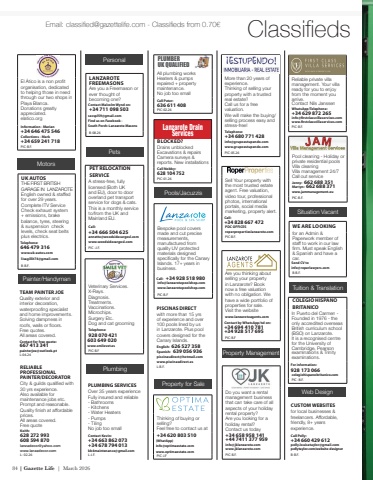 84 | Gazette Life | March 2026Mosquito Nets:Fixed - Roll down - SlidingC/ Matorral, 6%u2013Tias. Tel: 928 524 597 Open: Monday to Friday: 8am to 4pm. Up to date machinery for manufacturingand construction of aluminium products 0034 618 918 433 %u2022 email : theallyshop@gmx.com %u2022 www.theallyshop.comTWO COLOURALUMINIUM FRAMESInterior & Exterior Factory produced - powder coatingWe manufacture, supply & install powdercoated aluminium windows, doors,pergolas, shutters and mosquito netsAlso fly screen doorsFASTEFFICIENT & RELIABLESERVICEFind usin the Tias Map No. 1 We manufacture, supply & install powdercoated aluminium windows, doors, l h tt d it tClassifieds Email: classified@gazettelife.com - Classifieds from 0.70%u20acProperty for SaleSell Your property with the most trusted estate agent. Free valuation, video tour, professional photos, international portals, social media marketing, property alert.Call:+34 828 667 472PDC OFFICES roperpropertieslanzarote.comPIC-B.F.Painter/HandymanRELIABLE PROFESSIONAL PAINTER/DECORATORCity & guilds qualified with 30 yrs experience. Also available for maintenance jobs etc. Prompt and reasonable. Quality finish at affordable prices. All areas covered. Free quoteKeith: 628 272 993608 594 870lanzadecor@yahoo.comwww.lanzadecor.comL- 02.26PersonalPetsPLUMBING SERVICESOver 35 years experienceFully insured and reliable- Bathrooms - Kitchens- Water Heaters - Pumps - TilingNo job too smallContact Kevin: +34 663 862 073+34 678 794 013kb4maintenance@gmail.comL-J.F. Property ManagementPool cleaning - Holiday or private residential poolsVilla cleaningVilla management 24/7Call out serviceJenny: 662 688 351Martyn: 662 688 371www.jammanagement.euPIC-B.F.Veterinary Services.X-Rays. Diagnosis. Treatments. Vaccinations. Microchips. Surgery Etc.Dog and cat groomingTelephone:928 070 421603 649 020www.smilevet.esPIC-B.FLANZAROTE FREEMASONSAre you a Freemason or ever thought of becoming one?Contact Malcolm Wynd on:+34 711 098 503secspl59@gmail.comFind us on Facebook - South Porch: Lanzarote MasonsB-08.26Pools/JacuzzisTEAM PAINTER JOEQuality exterior and interior decoration, waterproofing specialist and home improvements.Solving dampness in roofs, walls or floors. Free quotes. All areas covered.Contact for free quote: 667 413 341painterjoe@outlook.ptL-04.24Lanzarote Drain ServicesBLOCKED?Drains unblockedExcavations & repairsCamera surveys & reports. New installationsCall Nobby: 628 104 752PIC-01.26Are you thinking about selling your property in Lanzarote? Book now a free valuation with no obligation. We have a wide portfolio of properties for sale.Visit the websitewww.lanzaroteagents.comContact by WhatsApp/tel on: +34 694 410 781+34 928 517 695PIC-B.FPISCINAS DIRECTwith more than 15 yrs of experience and over 100 pools lined by us in Lanzarote. Plus pool covers designed for the Canary Islands. English: 626 527 358Spanish: 639 056 936piscinasdirect@hotmail.comwww.piscinasdirect.esL-B.F.More than 20 years of experience. Thinking of selling your property with a trusted real estate? Call us for a free valuation. We will make the buying/selling process easy and stress-free!Telephone:+34 680 771 428info@grupoestupendo.comwww.grupoestupendo.comPIC-05.26PLUMBERUK QUALIFIEDAll plumbing works Heaters & pumps repaired + property maintenance. No job too smallCall Peter: 636 611 408PIC-02.26Do you want a rental management business that can take care of all aspects of your holiday rental property? Are you looking for a holiday rental? Contact us today+34 658 958 141+44 7411 377 959info@jklanzarote.comwww.jklanzarote.comPIC-B.F.Reliable private villa management. Your villa ready for you to enjoy from the moment you arrive.Contact Nils JanssenWhatsApp/Telephone:+34 629 872 265info@firstclassvillaservices.comwww.firstclassvillaservices.comPIC-B.F.MotorsUK AUTOSTHE FIRST BRITISH GARAGE IN LANZAROTEEnglish owned & staffed for over 29 years.Complete ITV ServiceCheck exhaust system + emissions, brake balance, tyres, steering & suspension check levels, check seat belts plus electrics.Telephone: 646 479 316www.uk-autos.comlisagillit74@gmail.comB-B.F. Bespoke pool covers made and cut precise measurements, manufactured from quality UV protected materials designed specifically for the Canary Islands. 17+ years in business.Call: +34 928 518 980info@lanzarotepoolshop.comwww.lanzarotepoolshop.comPIC-B.Ffifffffflffiflffi%u001afi%u0019ffi%u001afi%u0018%u0017%u0016%u0019ffl%u0016%u001a%u0015%u001afifffflffifl%u001a%u0019%u0018fi%u0017%u0016%u0015%u0014%u0013flffl%u0012%u001afifffflffifl%u001afffifffflfflffififlffl%u001a%u0019%u0018%u0017%u0019%u0018%u0017%u0016ff%u0019%u0017%u0015%u0016%u0019%u0014%u0013%u0012%u0019%u0012fl%u0019ffi%u0011ff%u0014%u0010fflff%u0019%u0018ff%u0017ffl%u0013%u0011ff%u0018ff%u0015%u0012ffl%u000f%u0019%u0018%u0017%u0015%u0013%u000e%u0017%u0014%u0012%u0013%u0011ff%u0016%u0019%u000e%u0011fl%u0018 %u0016%u0015%u0014ffi%u0013%u0012%u0011fi%u0010%u000ffiff%u0018ffl%u0012%u0019fl%u0012%u0019%u000efi%u0014%u0012%u0019%u0018%u0013%u0014ffi%u0017%u0019%u0016ffffl%u0010%u0015ff%u0016%u0019fflffiff%u0014%u0010%u000c%u0014%u0017%u000b%u000b%u0019%u000efl%u0011%u0019%u0012%u0009ff%u0019%u0008%u0017%u0015%u0017%u0011%u0019%u0007ffl%u000b%u0017%u0015%u0016ffl%u0006%u0019%u0019%u000cff%u0019%u000bfi%u000c%u0009%u0008%u0007%u0006fi%u0012fflfi%u0005%u0004%u0003%u0008%u0007%u0006fi%u0005%u0004%u0003%u0019%u0012%u0010%u000b%u000b%u0019%u0001%u0003%u0019%u0019%u0008%u0017%u000b%u000bff%u0019%u0013%u0011%u0081%u0013%u0010%u0017%u0019%u008d%u000f%u0019%u008f%u0004%u0090%u009d%u0019%u008d%u00a0%u000f%u0019%u0001%u000b%u0017%u0017%u0019fi%u000b%u0017%u0015%u0014%u0017%u0019%u00ad%u0080%u0082%u000f%u0019%u0083%u0004%u0007%u0084%u0004%u000f%u0019%u0085%u0017%u0015%u0086%u0017%u0011fl%u0012fffifififffflffifl%u001affi%u0019%u0018%u0017%u0016%u0015%u0018%u0018ffl%u0014%u0013%u0018%u0015ff%u0012%u0018%u0011%u0010%u0019%u0007%u0015%u000efl%u0087%u0018%u0088ffi%u000b%u0017%u0015%u0086%u0017%u0011fl%u0012ff%u0006%