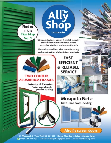 March 2026 | Gazette Life | 85Mosquito Nets:Fixed - Roll down - SlidingC/ Matorral, 6%u2013Tias. Tel: 928 524 597 Open: Monday to Friday: 8am to 4pm. Up to date machinery for manufacturingand construction of aluminium products 0034 618 918 433 %u2022 email : theallyshop@gmx.com %u2022 www.theallyshop.comTWO COLOURALUMINIUM FRAMESInterior & Exterior Factory produced - powder coatingWe manufacture, supply & install powdercoated aluminium windows, doors,pergolas, shutters and mosquito netsAlso fly screen doorsFASTEFFICIENT & RELIABLESERVICEFind usin the Tias Map No. 1 We manufacture, supply & install powdercoated aluminium windows, doors, l h tt d it t