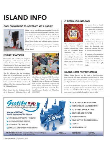 8 | Gazette Life | November 2025ISLAND INFODoing a bit of early Christmas shopping? Or maybe you just fancy something beautiful in your life. Either way, head to the lovely CIAN Gallery at C/Le%u00f3n y Castillo 6 in Teguise%u2019s old town where talented jeweller Tania Candela of Famaraspirit and painter Elena Molto display and sell their unique creations. Inspiration, natural beauty and untamed creativity %u2013 it%u2019s a touch of Famara%u2019s mystical spell in the heart of the island. HARVEST DELIVEREDCHRISTMAS COUNTDOWNOn Sunday 5th October, the Anglican Chaplaincy of St Laurence held the annual Harvest Thanksgiving service. Contributions of fresh and tinned foods were gratefully received, along with cash donations in colourful envelopes.On the following day, the donations, along with 30 kgs of chicken legs and 18 kgs of fish, were presented to Sor Ana, the nun who founded and runs Arrecife%u2019s Calor y Caf%u00e9 centre for the homeless. A delighted Sor Ana is pictured above with Fr. William Mounsey.Don't forget that the Anglican church of St Lawrence's Christmas Fayre will take place on Saturday 13th December at Hanky Panky's in the Monta%u00f1a Tropical centre at Puerto del Carmen from 2.00pm. The Fayre is open to all and if anyone is interested in helping or participatingwith their own stall they should contact Deirdre on WhatsApp 630789447.CIAN: CO-WORKING TO INTEGRATE ART & NATURE The Gazette%u2019s popular online Advent Calendar will be returning for a fifth year in December! From December 1st %u2013 25th, everyone who enters the draw will get the chance to win dozens of terrific prizes all the way up to the big day.Our Advent Calendar has always been a hugely popular event on Lanzarote, and a great way to find out more about the wonderful range of businesses on the island.Entry is free; there%u2019s no catch! To enter, all you need to do is like, comment & share the Facebook post about the calendar that will be posted sometime soon%u2026If you want to be among the first to receive updates about the Advent Calendar, be sure to subscribe to our free weekly newsletter (Scan QR Code.)Milano Home Factory, on the road to San Bartolom%u00e9 from Arrecife, will have unbeatable special offers for those renovating holiday rental properties, as well as huge discounts on all products for hotels and apartment complexes.If you%u2019re involved in this key sector of the island%u2019s economy, or even if you just need some new home d%u00e9cor ideas, you need to see what Milano Home Factory %u2013 one of the island%u2019s most trusted and established suppliers- have to offer. MILANO HOME FACTORY OFFERS