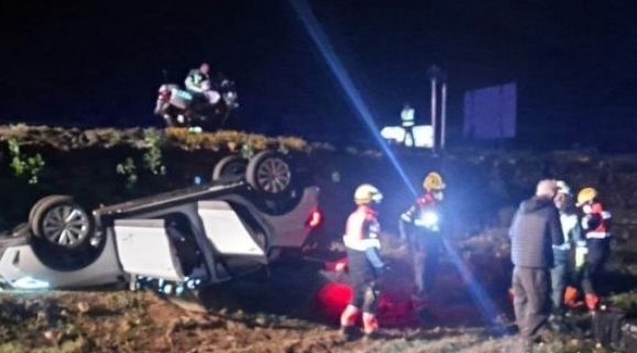 NewsAn 84-year-old woman has been taken to hospital after her car left the road and overturned.