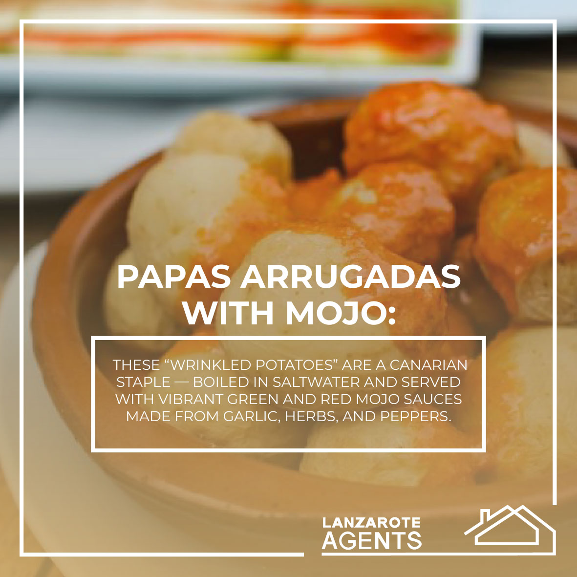 Papas arrugadas with mojo: These “wrinkled potatoes” are a Canarian staple — boiled in saltwater and served with vibrant green and red mojo sauces made from garlic, herbs, and peppers.