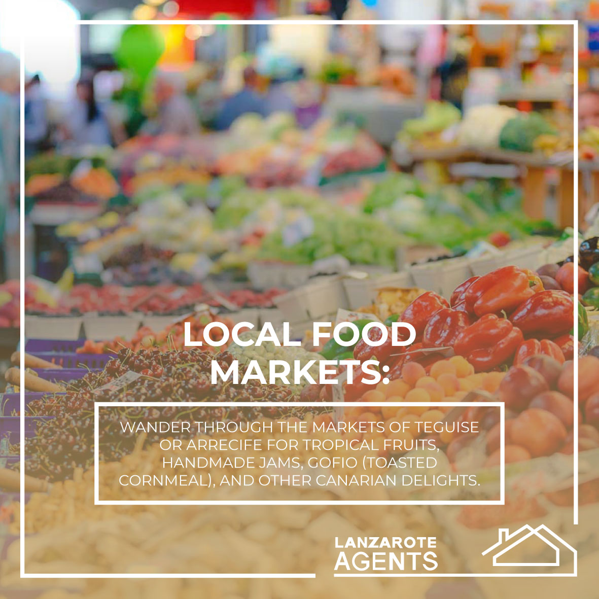 Local food markets: Wander through the markets of Teguise or Arrecife for tropical fruits, handmade jams, gofio (toasted cornmeal), and other Canarian delights.