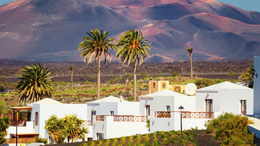 The iconic white, flat-roofed architecture of Lanzarote, set against the volcanic landscape. Modern domestic aljibes are typically filled by tanker rather than rainwater.