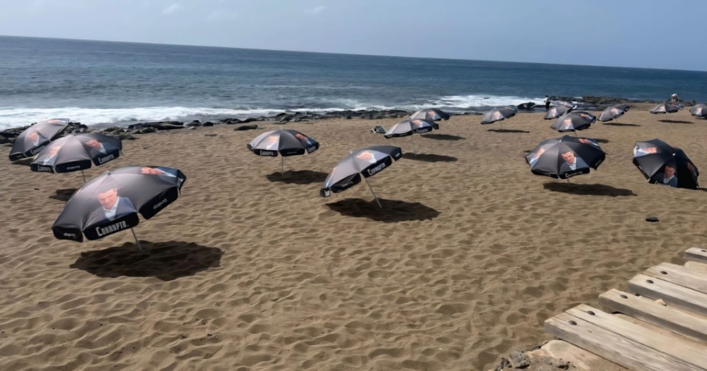 The Hazte Oìr (Make Yourself Heard) group decorated the beach with dozens of specially printed umbrellas with photos of Sánchez and the word “Corrupt” printed on them in the typeface used for the film “The Godfather”. Playa Bastían is almost a kilometre east of the residence at La Mareta where the Sánchez family are spending their summer holidays.