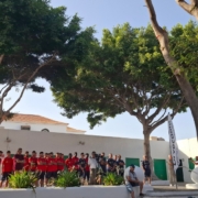 Members of UD Lanzarote’s 2025/26 squad and technical team under the impressive Indian fig trees at Arrecife’s Recova last night as they wait to be officially presented to the public.