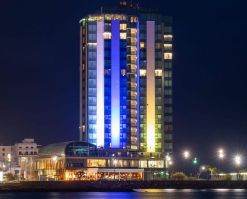 NewsThe tallest building on Lanzarote, the Gran Hotel in Arrecife, was illuminated with the colours of the Canary Islands flag this week to celebrate Dia de Canarias.